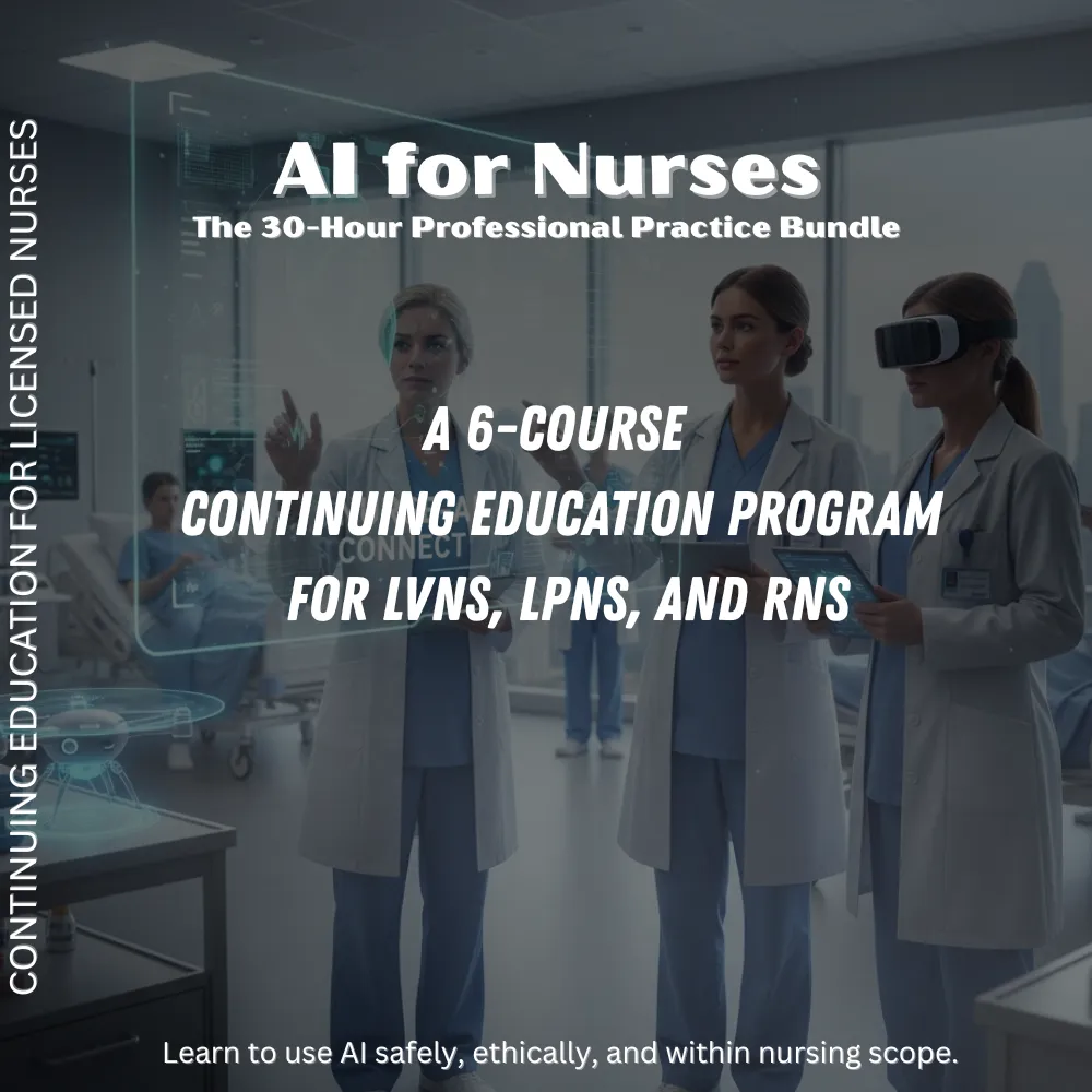 A 6-course, 30-hour continuing education bundle that teaches LVNs and RNs how to use AI safely, ethically, and within scope — plus a free copy of “The Five Rights of AI in Healthcare” e-book when you enroll.